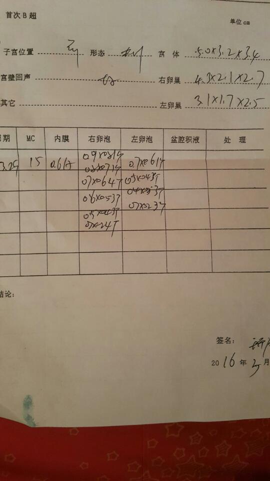 阴道超声检查 年龄26,备孕!请问,如图检查是什么意思,看不懂 阴道超声检查。年龄26,备孕!请问,如图检查是什么意思,看不懂 点击展开 鼠二365 2016-03-29 12:28 为您推荐: 其他回答 问问医生啊 么么哒12345 2016-03-29 17:38 看不出来,实在看不清,若排了就不会写了 cn#BuuGpuffuk 2016-03-29 14:51 你这是月经第几天?没有优质的呢,如果刚完事照的就是还在长 小鹍的美女老婆 2016-03-29 12:37 应该是没排 cn#BuuGpuffuk 2016-03-29 12:35 监测卵泡的大小,不过写得不清不楚 cn#BuuGpuffuk 2016-03-29 12:32 加载更多 相关问题 怀孕两个月 做阴道超声检查:专家看下这个检查有什么问题,着急! 阴道超声检查左侧宫外孕中为什么超声提示左侧宫外孕位置偏向右侧附件区 停经44天去医院经阴道超声检查: 子宫体大小约为4 2*4 3*4 6CM,表面光滑,肌层回声均匀