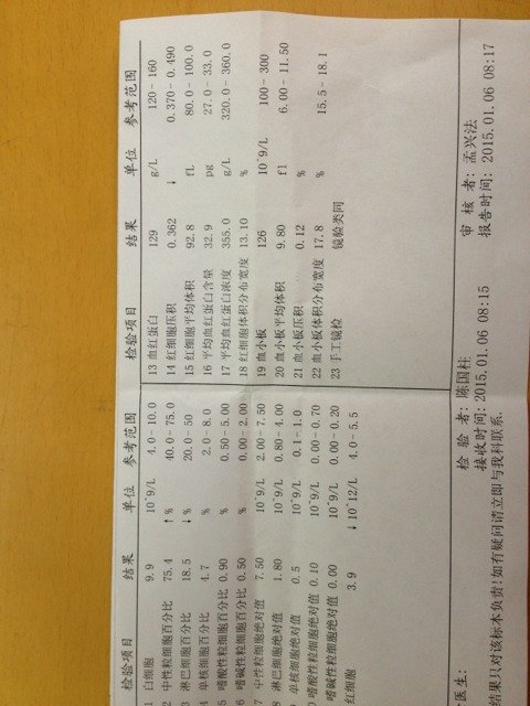 这是刚测血常规,哪位专业人士知道我该注意些什么?谢谢!^-^ 这是刚测血常规,哪位专业人士知道我该注意些什么?谢谢!^_^ 点击展开 @木棉花 2015-01-06 11:44 为您推荐: 其他回答 要注意休息 Love smile giggle 2015-01-06 18:38 你的血常规检查结果显示,中性粒细胞高于正常值,说明有细菌感染的情况,不知道你有不舒服的地方吗? cjtao799 2015-01-06 15:42 没事儿!宝妈好孕 138*****330_7mSN 2015-01-06 13:30 我看淋巴细胞也偏低,应该有点呼吸道感染!应该是着凉了!宝妈好孕 138*****330_7mSN 2015-01-06 12:41 没什么大事就是有点贫血 138*****330_7mSN 2015-01-06 12:38 加载更多 相关问题 请专业人士帮我看看我宝宝的血常规化验单 有医生或专业人士吗?我家宝宝六个月时做的血常规检查104医生说贫血!今天九个月了又去做检查血常规9 有医生或专业人士吗?我家宝宝六个月时做的血常规检查104医生说贫血!今天九个月了又去做检查血常规9