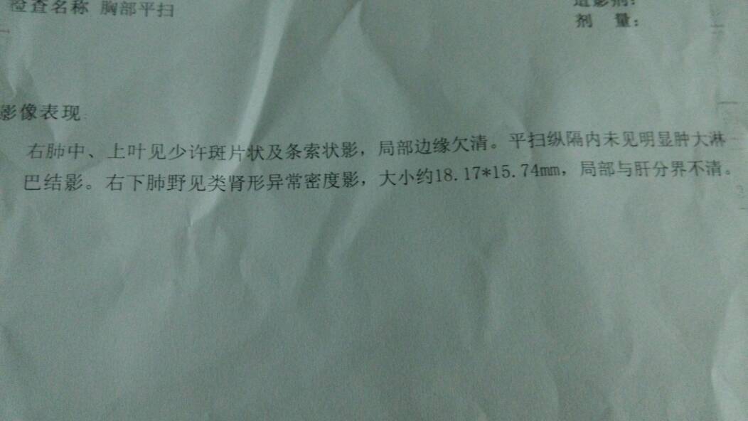 今天去做CT,结果是右下肺野见类肾形异常密度影,很好奇这是什么,医生不确定我是否可以停药,我已经吃 今天去做CT,结果是右下肺野见类肾形异常密度影,很好奇这是什么,医生不确定我是否可以停药,我已经吃了将近一年的结核药了,去年被确诊为结核性胸膜炎 点击展开 匿名用户 2015-05-02 18:26 满意回答 肺结核属于糟辨愚什么类型的,目前看你不能停药,洞破胸膜炎一顿筝般看情况,有积液的引流,没有积液的吃药或者吊水即可 库秀娟_9yLu 2015-05-03 22:08 宝宝知道提示您:回答为网友贡献,仅供参考。 相关问题 两周消炎处理后,拍ct,左肺野见密度不均、边缘? 腰酸ct检查左肾上极见一巨大圆形低密度影直径约7cm CT显示右侧肺门处可见团状高密度阴影,边缘毛糙