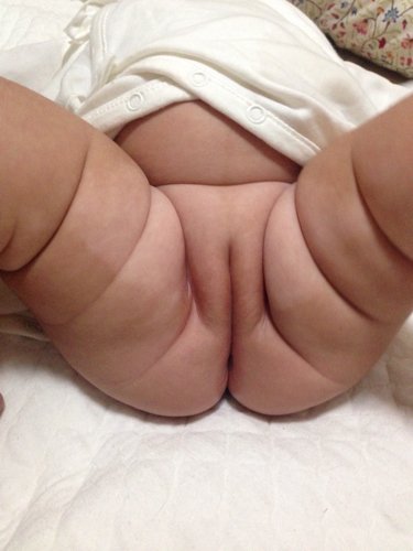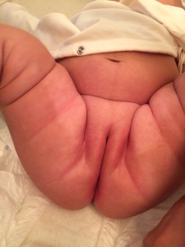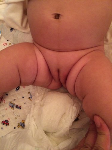 宝宝一个多月的时候换尿片时突然发现会阴和大腿内侧有对称形状白斑,白斑上侧边缘不明显,下侧边缘很明显