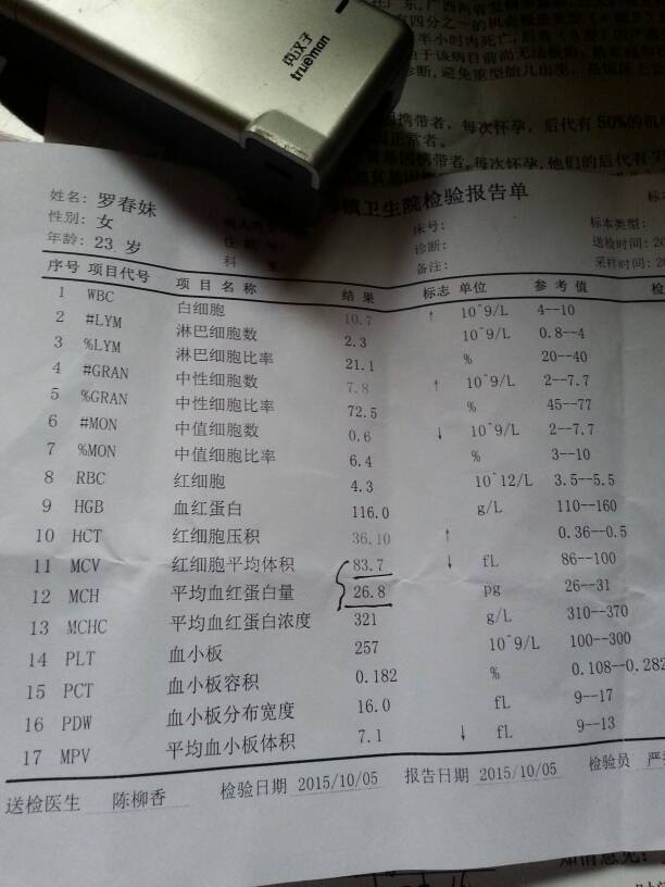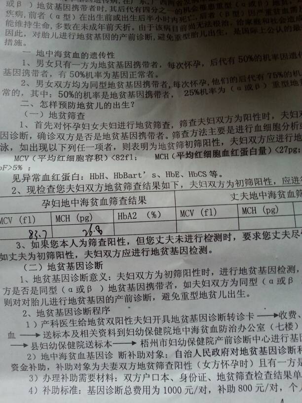 怀孕6个月:地中海贫血基因诊断知情告知书 请问这是地中海贫血吗?严不严重? 点击展开 匿名用户 2015-10-05 16:44 满意回答 你好,目前的检查结果显示初筛是慕兵阳性,近遮法病情算是一般,建议积极治缘潜疗 cn#BppGkuppfQ 2015-10-05 16:49 宝宝知道提示您:回答为网友贡献,仅供参考。 相关问题 做了地中海贫血基因诊断,结果还没有出来,如果结果有地中海贫血怎么办啊 怀孕几个月做地中海贫血检查?怀孕几个月做唐氏筛查?几个月抽羊水,几个月抽脐带血? 怀孕32周怀疑有地中海贫血和缺铁可以吃右旋糖酐铁片和复方红衣补血口服液吗
