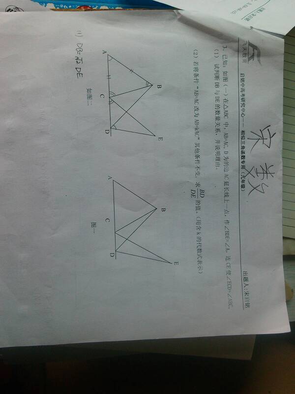 连接BE,BD与CE交于O点 ∵∠ACB+∠A+∠ABC=180º,又∵∠ACB+∠BCE+∠ECD=180º ∴∠ECD=∠ABC,∠A=∠BCE=∠BDE ∴△COB∽△DOE,OC/OD=OB/OE ∵相耻∠COD=∠BOE ∴△COD∽△BOE ∠OBE=∠OCD=∠ABD 又毫药∵∠A=∠BDE ∴△ABC∽玻玻筝△DBE ∴BD/DE=AB/AC=k