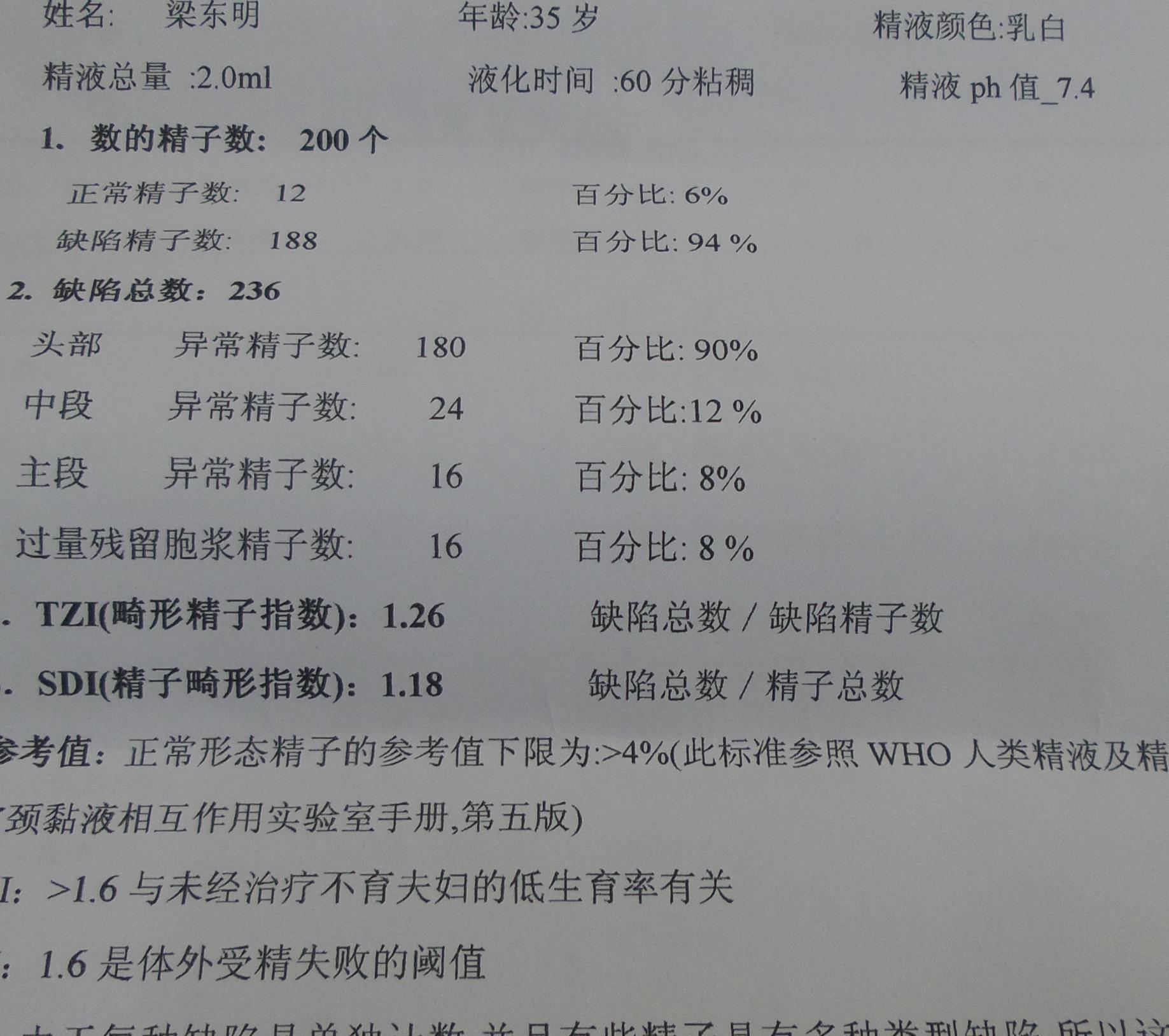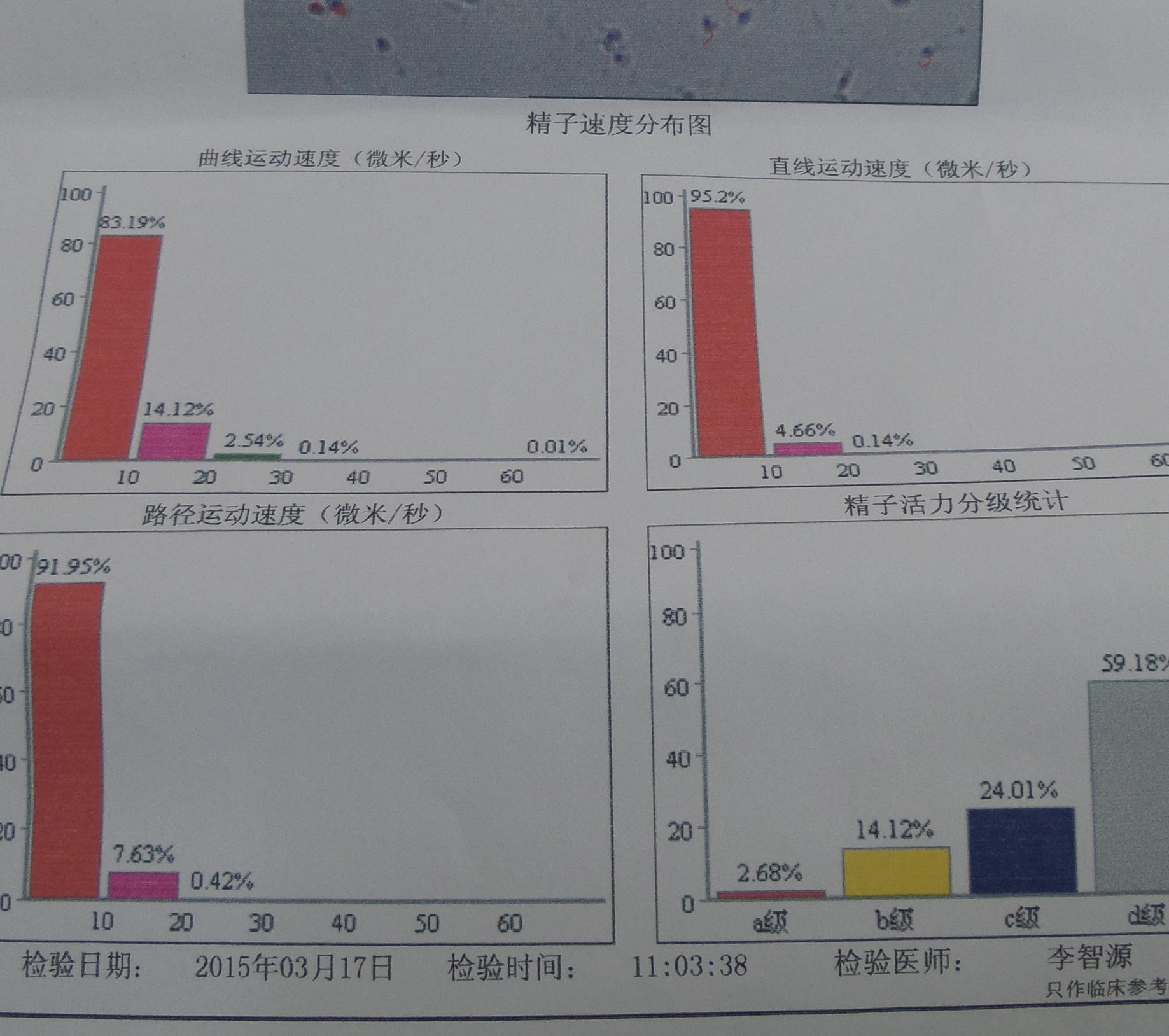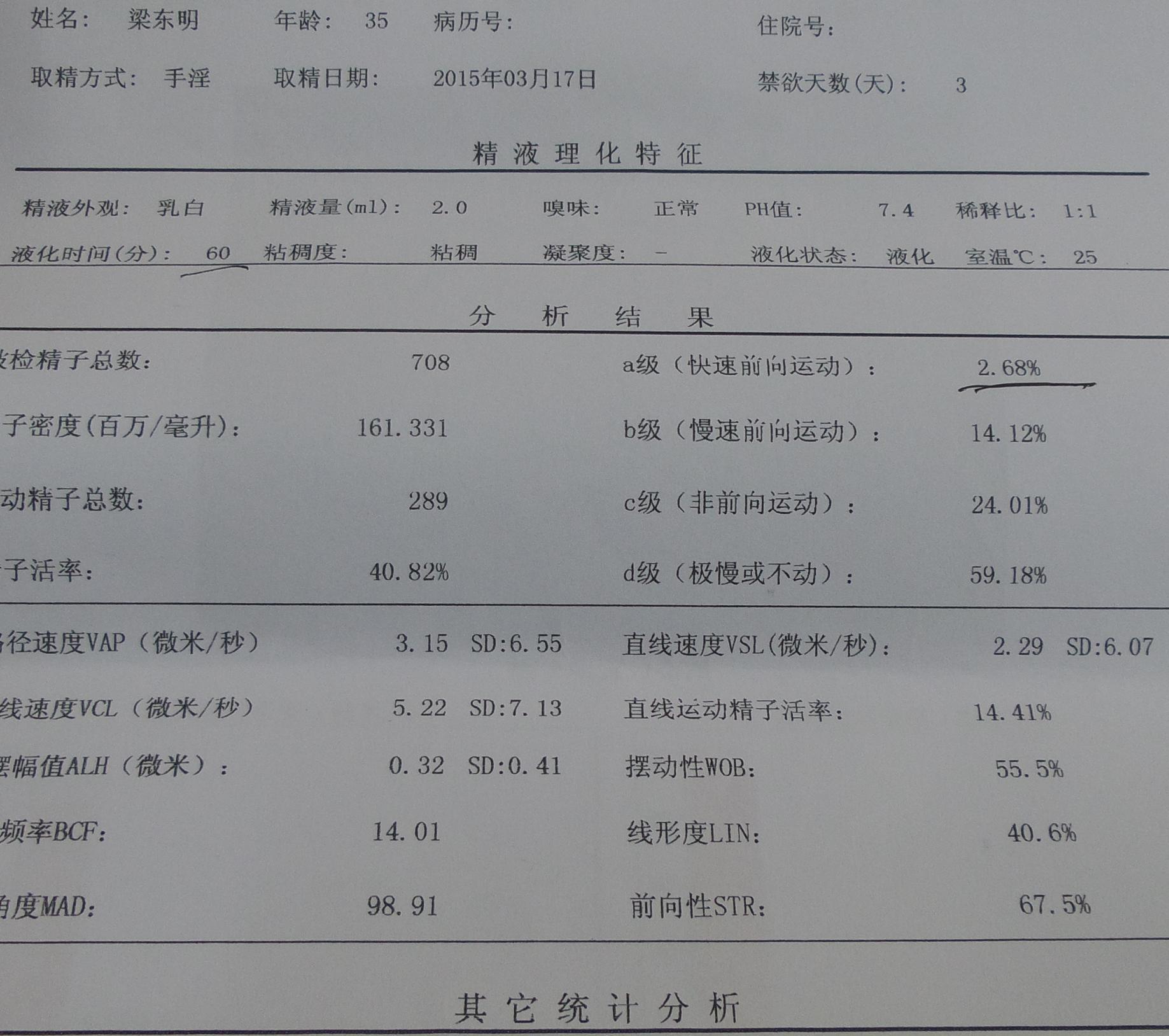精液检查结果本人想备孕! 点击展开 匿名用户 2015-03-18 16:31 为您推荐: 其他回答 你的精子活力很差啊,恐怕很难啊,对于你的情况,建议不要盲目就医,自行买药服用,以免延误诊治,加重病情;最好到正规医院相关科室治疗,早治疗早康复;平时要加强身体锻炼,提高自身抵抗力,避免劳累,受凉,感冒,注意饮食,多食新鲜水果,蔬菜。 ding198861690 2015-03-18 16:50 相关问题 备孕一年多,未怀上,去医院检查精液检查结果,请帮忙看看结果 请问:我的精液检查结果:精液粘 精液检查结果,大家帮忙分析下 谢谢