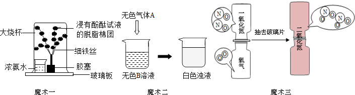 (1)可观察到“铁树”上浸有无色酚酞试液的棉团由白色变为红色,该魔术中没有涉及的性质是B;因为A.氨分子是不断运动的,C.浓氨水具有挥发性,D.氨气的水溶液显碱性由此魔术可以得出,而B.氨分子有一定质量不敢迷能证明; (2)当气体A加到B烧杯中,无色溶液变成白色浊液.若A为二氧化碳则B为澄清石灰水即可;反应的化学方程式为:CO 2 +Ca(OH) 2 ═CaCO 3 ↓+H 2 O; (3)由题意知相同条件下婚耀,向A、B两个体积相同的集气瓶中分别充满无色的一氧化氮气体和氧气,抽走玻片,两瓶均由瓶口向瓶底逐渐充满红棕色气体.涉及反应的化学方程式为:2NO+O 2 ═2NO 2 ;CO和C常作还原剂的原因是:在反应中C元素的化合价都升高,由此推断该反应中的还原剂是 NO;因2NO+O 2 ═2NO 2 知,2分子的NO和1分子的O 2 反应生成怠蒸医2分子的NO 2 ,又因为相同条件下,相等体积的气体所含的分子数目相等,所以反应完毕后,瓶中剩余的气体为O 2 、NO 2 .故答案为:(1)B(2)CO 2 +Ca(OH) 2 ═CaCO 3 ↓+H 2 O;(3)2NO+O 2 ═2NO 2 ,NO,O 2 、NO 2 .