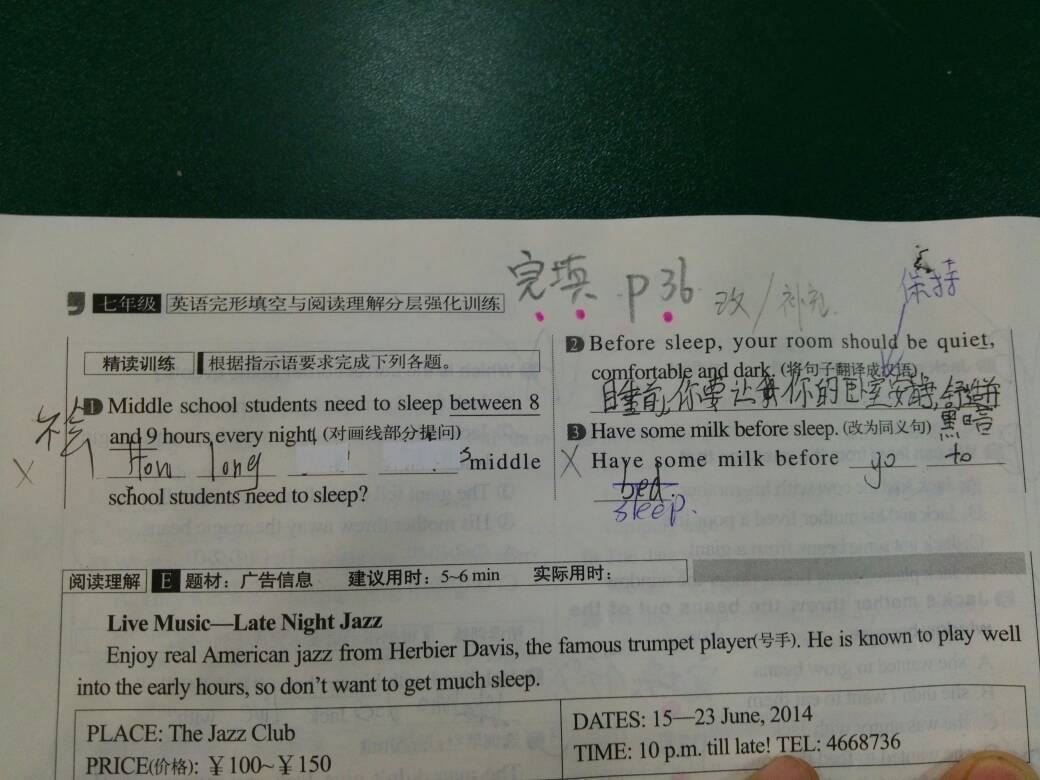 初一英语,我孩子的自主卷 1,2,3,都没回答正确,原题我再发给你,请学霸指点迷津 谢谢 点击展开 匿名用户 2015-04-30 14:29 推荐回答 1.how many hours do 2.在睡觉室抹前,你应当使你的房间保持安菜挡趋静,舒栋怪适并且黑暗。 3.going to sleep 匿名用户 2015-04-30 15:20 宝宝知道提示您:回答为网友贡献,仅供参考。 相关问题 初一英语 6,7,9,10 我孩子的自主卷,需要学霸给指点指点 谢谢 做这类题的时候有什 初三物理,15题,我孩子做的有不好的地方,请学霸和老师给与点拨 学霸们 这道题要怎么做啊 框里是小孩乱填的