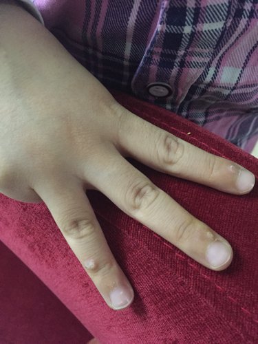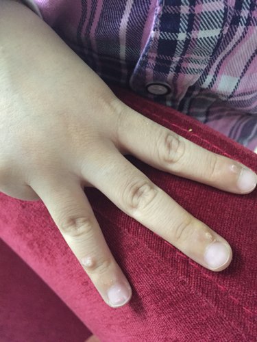 我家宝宝6周岁,四周岁时手指上长了一个小疙瘩,摸起来硬硬的、不疼也不痒,以为是瘊子没管它,最近指甲