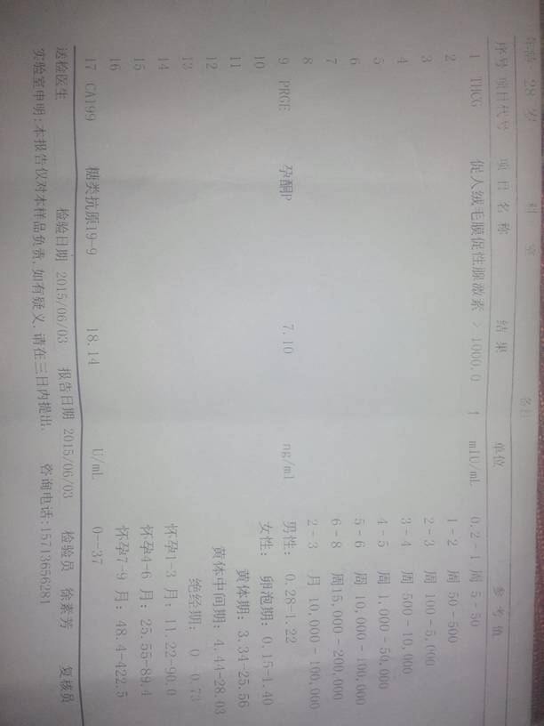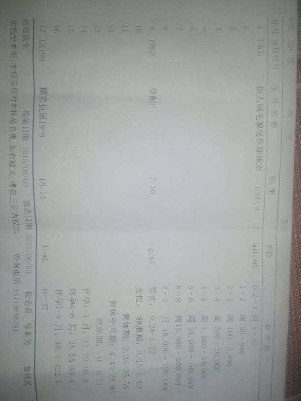孕前月经不正常,喝中药调理 求解决 点击展开 匿名用户 2015-06-03 20:31 满意回答 你好,根据你的检查结果怀孕了,大瓣套约怀孕4周震剩左右,建议悟竞亲隔天再去检查,期间注意休息。 cn#BfLffLfuLf 2015-06-03 21:33 宝宝知道提示您:回答为网友贡献,仅供参考。 相关问题 孕前中药调理生男孩准吗?有没有调理成功的宝妈? 宝妈们有试过产后中药调理吗?多久才能调理?我是剖宫产的,现在7个月,产后月子没做好,产后身体一直没孕前好 孕前吃中药调理,可以控制生男生女吗?