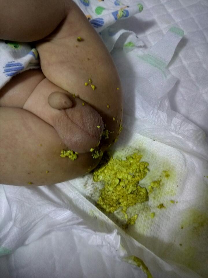 宝贝三十五天 十多天开始大便次数增多 无明显不适金黄色 奶瓣子 参杂黄水 当时母乳喂养
