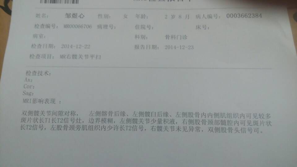 小孩摔了一跤走路一瘸一拐的,镇上怕CT说是两边不对称,怀疑有天生缺陷 刚做完核磁共振求诊断 点击展开 匿名用户 2014-12-23 14:46 为您推荐: 其他回答 这种情况的话,不排除是先天性的髋关节脱位的情况的,可以到骨科看看的,进行针对性的正畸治疗的。 知道张纪阳 2014-12-23 21:27 相关问题 两岁小孩突然走路一瘸一拐的,不痛不肿也不青,去了几家医院看了都说没事过几天就会好可过了半个多月了还 类似脑梗塞症状,但ct和核磁共振都显示不出 核磁共振和ct正常,脑供血不足怎么办