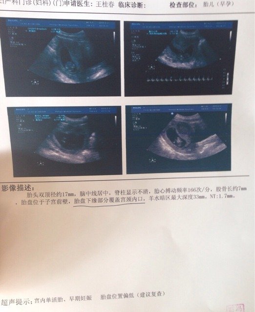 从提供的报告看,胚胎的发育符合孕早期的表现,羊水量正常,NT值正常。但现在胎盘下缘部分覆盖宫颈内口,考虑胎盘低置状态。建议暂时观察,禁止性生活,避免剧烈运动,孕晚期随着宫颈下端的形成胎盘位置有相对升高的可能。