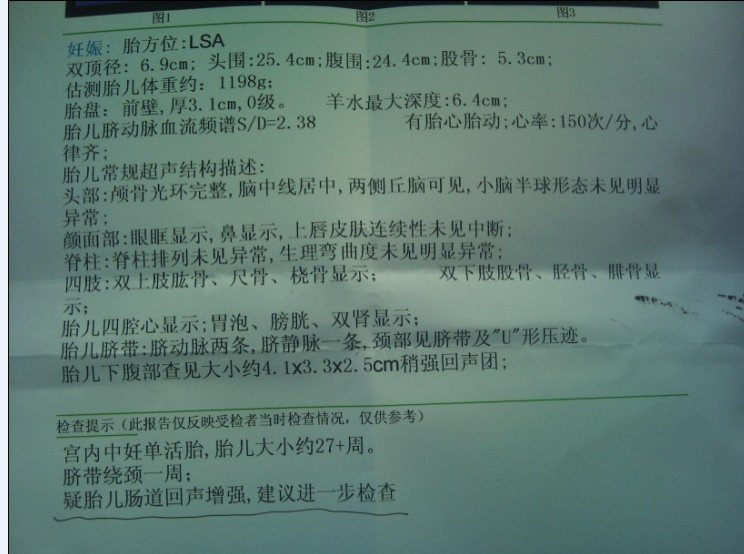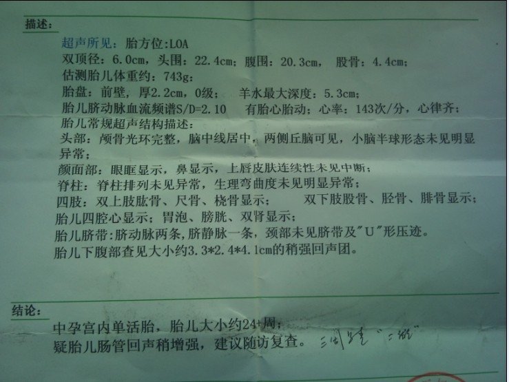 胎儿下腹部查见稍强回声团 定期检查做了四维彩超 发现胎儿肠管回声增强,半月后复查还是有这个症状 很担心! 点击展开 匿名用户 2014-03-17 18:19 为您推荐: 其他回答 病情分析: 根据你的情况,在怀孕的15-20周行唐氏筛选检查, 指导意见: 20-28周行四维彩超进行检查,确定胎儿的情况。另外现在加强营养,在怀孕13-27周补充钙剂促进胎儿发育。 纵寻桃_OzTg 2014-03-17 20:41 相关问题 胎儿下腹部,强回声团,意味着什么? 胎头为于下腹部,双顶颈9 3CM,羊水3 9CM,胎盘位于宫底左侧壁,内见散在强回声钙化,股骨长7 0CM 正常吗? 我无痛人流手术后老是断断续续有血,今天第九天了去医院查B超显示宫腔内见12;15;13的强回声光团