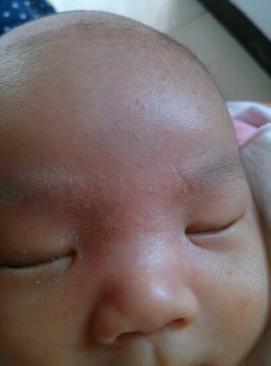 我家宝宝脸上身上头上都长好多这种小红颗粒,有的红的上还带一点白色的小点,看上去像很小的脓包,请问这