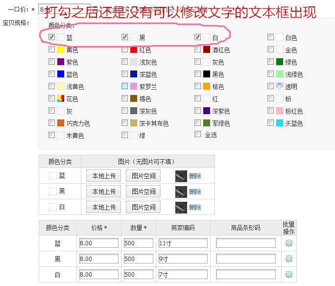 淘宝宝贝规格里颜色打勾后没有文本框显示可以自定义修改文字,这是为什么呢?换了浏览器也不行?求解 点击展开 匿名用户 2014-07-06 14:26 为您推荐: 其他回答 这种格式是显示宝贝的颜色分类,上传完以后自动在宝贝内页里面生成了! 匿名用户 2014-07-07 11:04 相关问题 淘宝宝贝图片规格,大小尺寸总是不合适,格子占不满,修改后图片失真在线求助 淘宝发布宝贝时候,,一个颜色下边有很多类别规格,比如小孩鞋子,女士,男士 怎么发布 如图 跪求,发布淘宝宝贝的时候,规格一栏的字数为什么我的限制在15个字,我的同行卖家就可以输入22个字