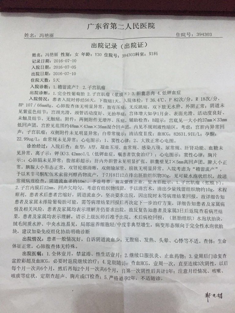 我刚做完葡萄胎的清宫手术,有出院证明,麻烦医生们在帮我看看,帮我解释一下,谢谢