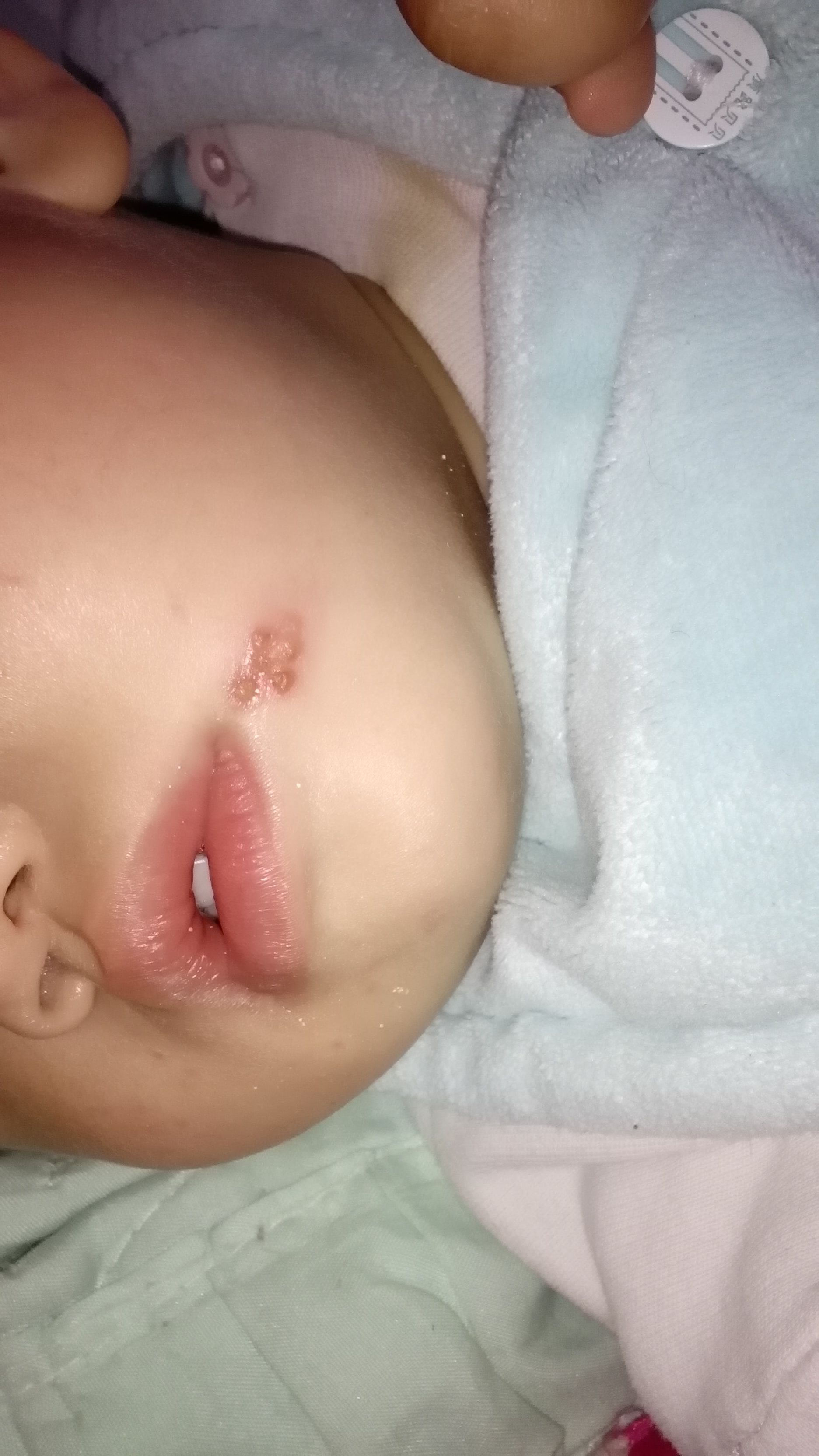 宝宝一岁嘴角边长了几个水泡泡,请问这是什么?怎么处理?是否因为身体缺乏某种微量元素导致?最先只有一个小的水泡泡,过了两天发现水泡在增加,有明显扩张局势。刚开始一个小泡泡的时候询问医生,给的建议是不用去管它,目前需要怎么处理?麻烦专业医生给出建议谢谢。附图1张: