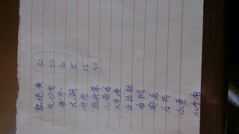 熟地黄30 北沙参30 麦冬30 元胡15 丹参15 益母草30 小茴香 炮姜 (好像是 金边桂) 香附 郁金 白芍 瓜蒌 水牛角