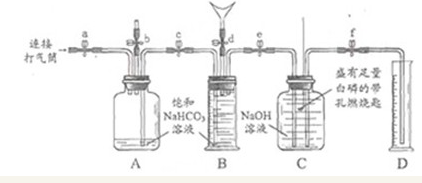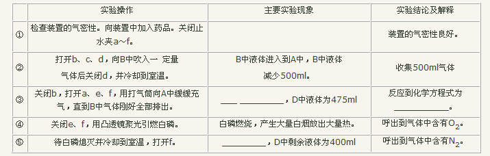 (2011•北京)化学课上,同学们做了人体呼出的气体使澄清石灰水变浑浊的实验后,对呼出的气体中主要成分及含量非常好奇,设计实验进行探究. 【提出问题】呼出的气体中有哪些主要成分,它们的含量是多少? 【查阅资料】 ①呼出的气体中仍含有O2. ②CO2在饱和NaHCO3溶液中的溶解度非常小. 【猜想与实验】 猜想:呼出的气体中主要成分是N2、O2、CO2、水蒸气等. 实化佳验I:验证呼出的气体中含有水蒸气. (1)实验操作如下图所示. (2)观察到的现象为 玻璃片表面有一层水雾 ,根据该现象可以富细搁判断呼出的气体中含有水蒸气. 实验II:验证呼出的气体中含有N2、O2、CO2,并测定其含量.同学们在老师的指导下设计了如下图所示装置(B是带刻度的量气装置). (1)实验记录 实验操作主要实验现象实验结论及解释 ① 检查装置的气密性.向装置中加入药品.关闭止水夹a~f. \ 装置的气密性良好. ② 打开b、c、d,向B中吹入一定量气体后关闭d,并冷却到室温. B中液体进入到A中,B中液体减少500mL. 收集500mL气体. ③ 关闭b,打开a、e、f,用打气筒向A中缓缓充气,直到B中气体刚好全部排出. A中液面下降,B中液面上升至最高,C中左侧导管口有气泡产生,且C中液面下降,液体沿导管流入D中 ,D中液体为475mL. 反应的化学方程式为CO2 2NaOH═Na2CO3 H2OCO2 2NaOH═Na2CO3 H2O . ④ 关闭e、f,径眠用凸透镜聚光引燃白磷. 白磷燃烧,产生大量白烟,放出大量热. 呼出的气体中含有O2. ⑤ 待白磷熄灭并冷却到室温,打开f. D中液体倒吸入C瓶中,C瓶中液面上升 ,D中剩余液体为400mL. 呼出的气体中含有N2. (2)数据处理 呼出的气体中主要成分的含量 N2O2CO2 体积/mL4007525 体积分数/€155 同学们经过3次重复实验,确认了呼出气体中的主要成分及其含量. 【实验反思】 (1)该实验设计依据的N2性质有ABD (填字母序号). A.难溶于水 B.不能和NaOH溶液反应 C.无色无味的气体 D.不能燃烧,也不支持燃烧 (2)实验II操作 ⑤中,若C中气体未完全冷却就打开f并读数,则所测O2的体积分数偏小 (填“偏小”、“不变”或“偏大”).