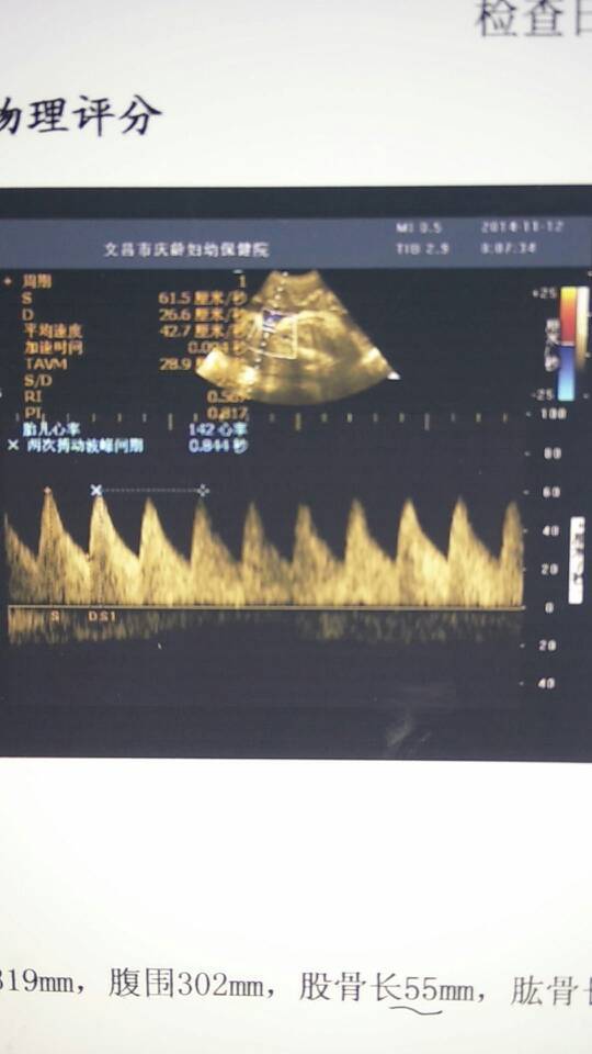 怀孕37周+4天B超声所见: 胎头位于上腹部 胎儿生长指标 双顶径90mm,头围3