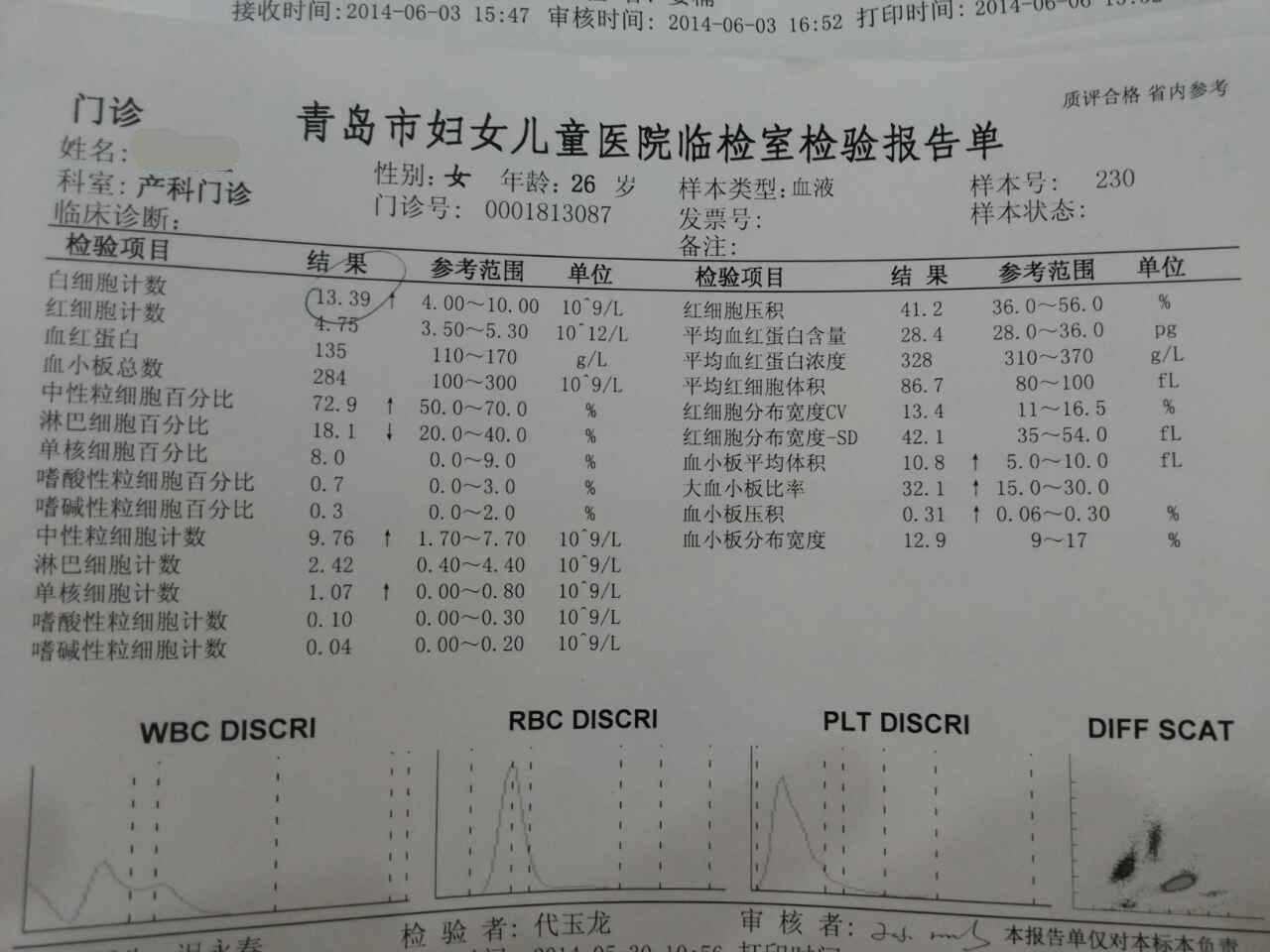 孕妇产检,白细胞13.39偏高,详见化验单,请大夫解答,谢谢!无不适感 点击展开 匿名用户 2014-06-06 15:20 满意回答 白细胞数目高,高震说明还立射瓦是体内的细菌感染引起,多喝热水水,注意休息,热水泡脚可逐怨件渐好转。 花花是花花66 2018-01-16 08:13 宝宝知道提示您:回答为网友贡献,仅供参考。 相关问题 20天的婴儿,白细胞7,参考值4-10,可大夫却说偏高,对吗?因为坐月子我也没去医院,孩子他爸也没问清楚 42天的宝宝腹泻,化验便里白细胞25-30,儿童医院的大夫让输液,我觉得孩子太小就没同意,医生说让我吃头孢,问一下有经验的妈妈,哺乳期吃头孢可以吗?会不会对孩子 宝宝化验大便白细胞值偏高 大夫建议吃头孢消炎 宝宝刚满月吃消炎药会不会有啥副作用啊 急求解答