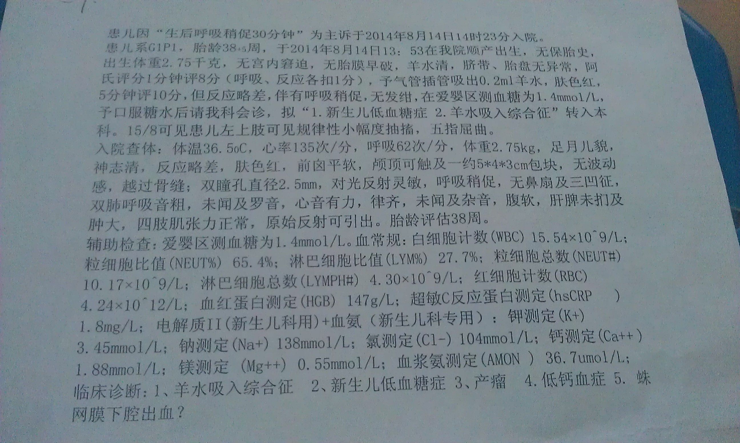 请问我家宝宝能够确诊为新生儿缺血缺氧性脑病(HIE)吗? 今天去拍了CT,CT诊断:考虑新生儿缺血缺氧性脑病,医生说和主治医生商量下,明天给回复。以下是宝宝出生后的诊断图和今天做的CT图,请懂行的大神帮忙分析下,到底是什么情况?出生后的诊断图:出生后一周也就是今天的CT图:诊断说发现8.15号发现抽搐,其他时间都没有发现抽搐,医生说要做个CT排除下是否颅内出血,因为我们是在妇幼保健院(二甲)生的小孩,做CT是护士抱宝宝到中医院(三甲)做的,中医院的医生在CT报告单上就写了考虑新生儿缺血缺氧性脑病。我把CT单给回中医院的儿科医生,儿科医生或要和主治医师商量下,明天给结果和要怎么治疗(他说要护脑治疗,高压氧什么的,具体结果明天给)。小孩一出生就抱到新生儿科去了,现在住院7天了,按照CT和诊断图是不是又要诊断为新生儿缺血缺氧性脑病啊?真是揪心 点击展开 匿名用户 2014-08-21 15:46 为您推荐: 其他回答 你好,这个时候还是需要进一步的检查的呢,宝宝这个时候还是不能确诊的呢,希望不会的哦 生活还在继续66 2014-08-21 15:51 相关问题 新生儿缺氧缺血性脑病HIE 我是山东聊城 小孩得了缺氧性脑病,新生儿1天 她妈妈没有新农合 但有医疗保险 小孩住院能报销吗?去那问? 新生儿出生第四天确诊为急性脑缺氧缺血性脑病,精神较好,已经住院治疗,在无菌婴儿箱中,由于分娩过程…