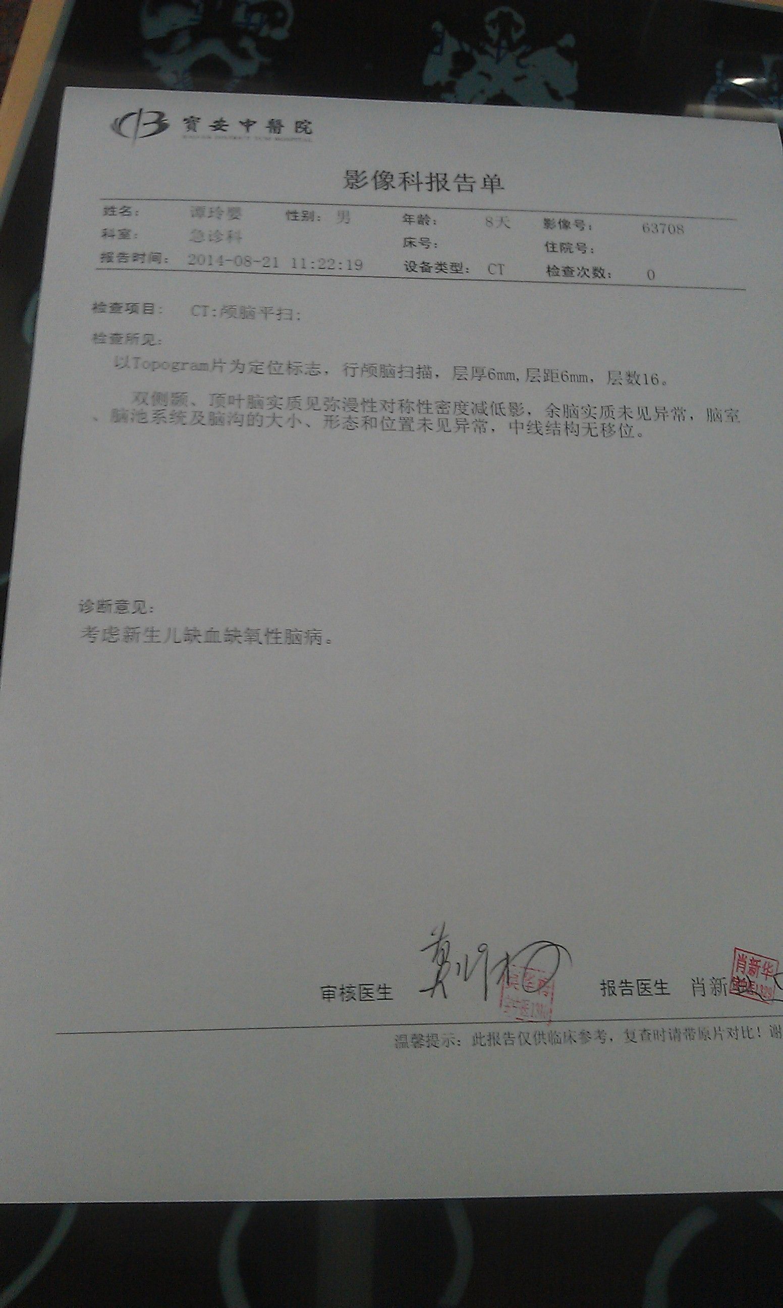 今天去拍了CT,CT诊断:考虑新生儿缺血缺氧性脑病,医生说和主治医生商量下,明天给回复。以下是宝宝出生后的诊断图和今天做的CT图,请懂行的大神帮忙分析下,到底是什么情况?出生后的诊断图:出生后一周也就是今天的CT图:诊断说发现8.15号发现抽搐,其他时间都没有发现抽搐,医生说要做个CT排除下是否颅内出血,因为我们是在妇幼保健院(二甲)生的小孩,做CT是护士抱宝宝到中医院(三甲)做的,中医院的医生在CT报告单上就写了考虑新生儿缺血缺氧性脑病。我把CT单给回中医院的儿科医生,儿科医生或要和主治医师商量下,明天给结果和要怎么治疗(他说要护脑治疗,高压氧什么的,具体结果明天给)。小孩一出生就抱到新生儿科去了,现在住院7天了,按照CT和诊断图是不是又要诊断为新生儿缺血缺氧性脑病啊?真是揪心