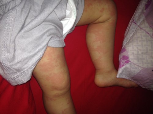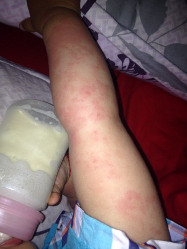 1岁3个月的宝宝身上长满了红疙瘩,手上脚上都有,因为在农村只有药店去看了,说是皮肤过敏性湿疹,买了