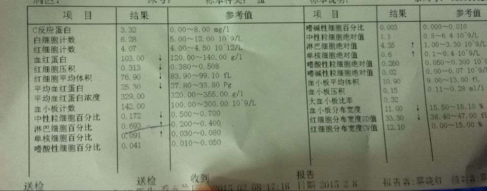 您好,9个月的宝宝最近感冒咳嗽严重去医院检查说是气管炎,血常规说是贫血,我特担心是不是白血病 宝宝9个月最近感冒咳嗽去医院检查说是气管炎,病毒性感冒,有点贫血,我特担心是不是白血病?因为我家刚搬到新房子两个月:但是又不敢妄自跟家人说带去检查,夜不能寐很是担心,请医生给于参考:万分感激 点击展开 衣清宁_9LAu 2015-02-10 21:33 为您推荐: 其他回答 没有迹象表明是白血病,不要太紧张。小孩子由于发育太快,很多贫血的。您孩子是轻度贫血适当增加点营养、补点铁就没事了。不用的担心是白血病。 wen_yf 2015-02-10 21:48 相关问题 专家您好!我家宝宝就快9个月了,因感冒咳嗽气管炎已近一个月,现已好转 1岁4个月宝宝总是反复咳嗽流鼻涕、验了血常规说是抵抗力很低、用什么方法可以提高抵抗力呢? 7个多月宝宝还要吃鱼肝油吗?上次做过血常规就有点贫血?还要吃滴什么辅助品哦???