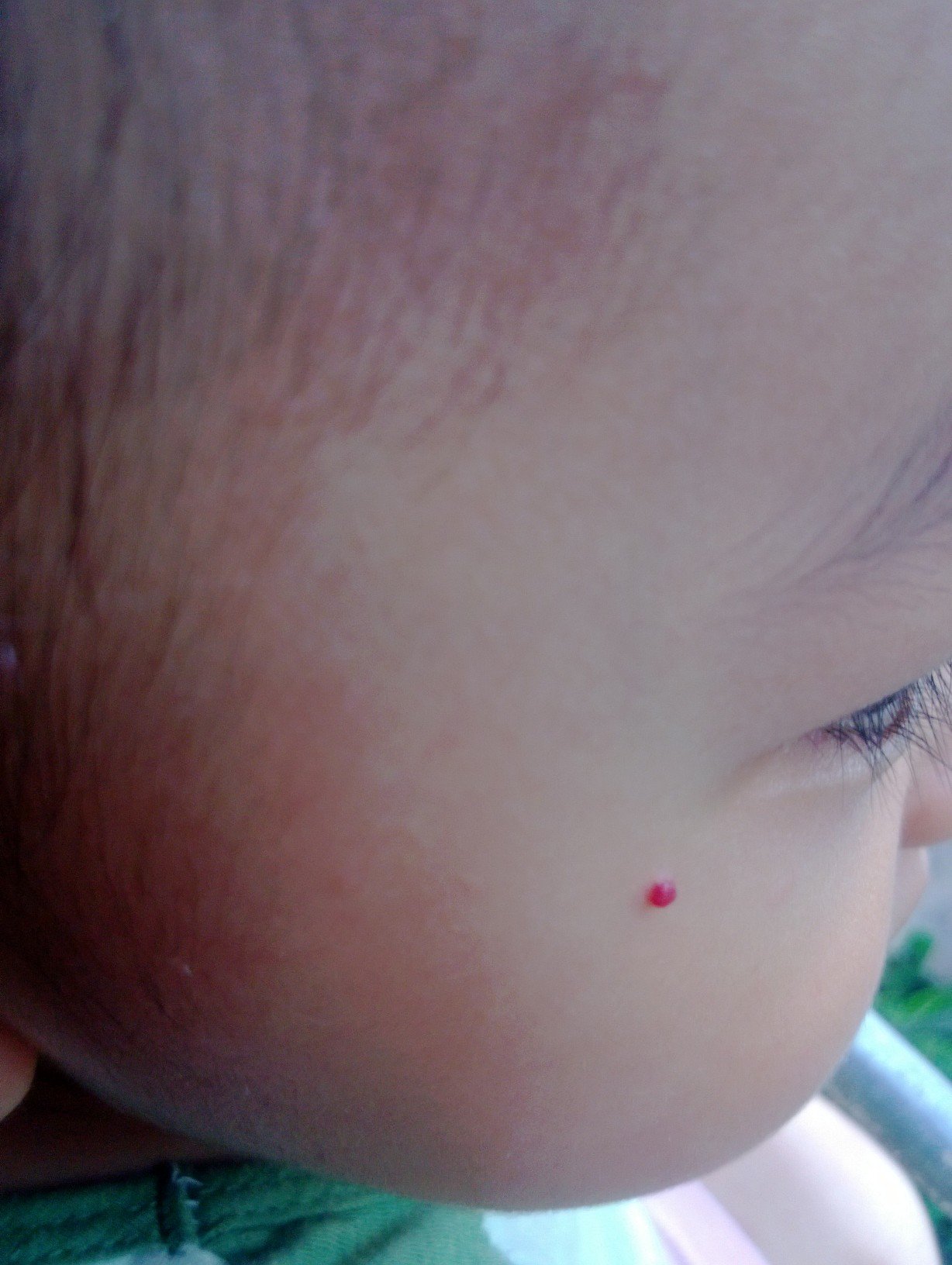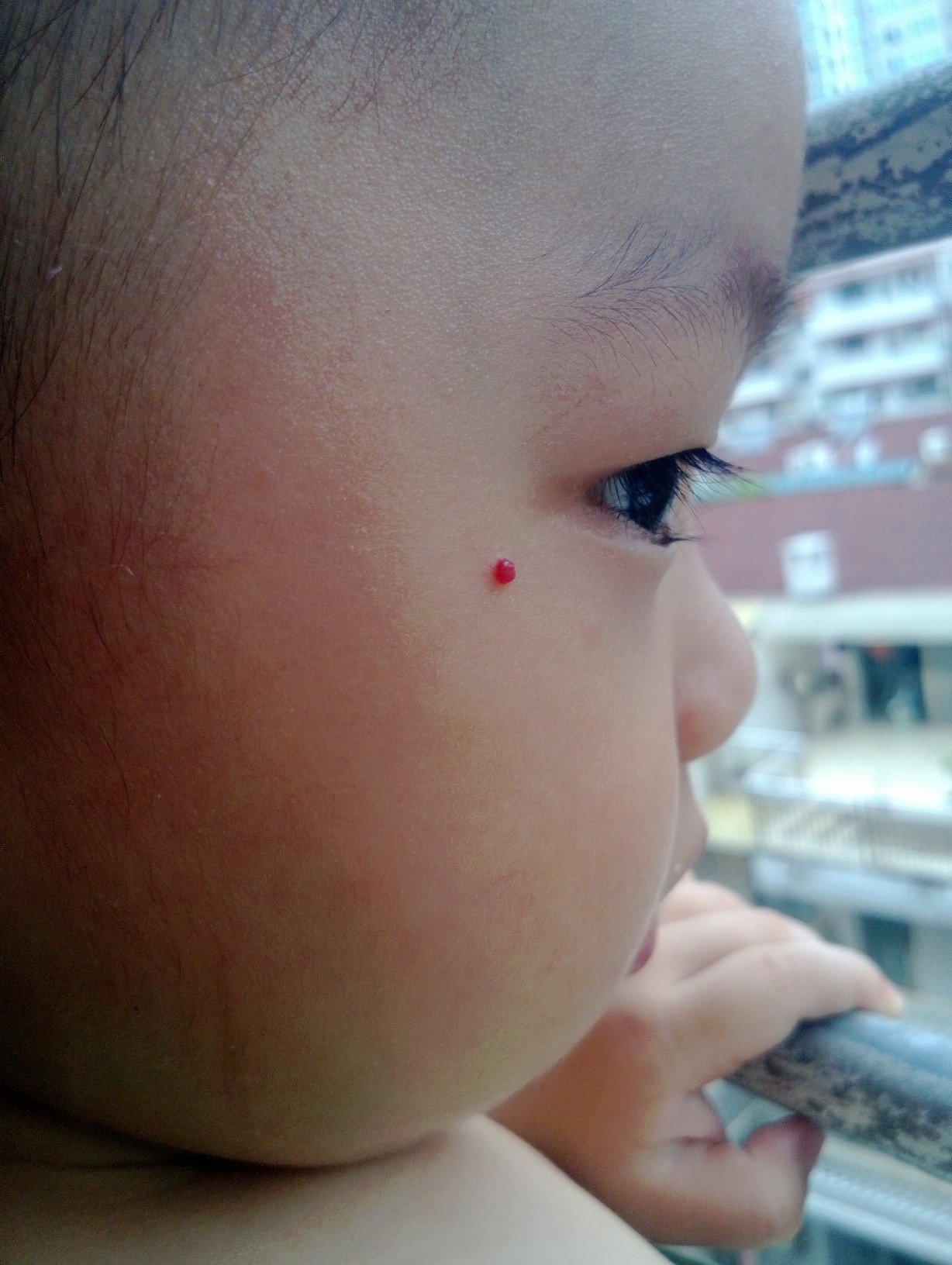 我小的时候也长过和这个一摸一样的,也是在脸上,如果不小心弄破了就血流不止很害怕,后来好像是说毛细血管破裂造成的我也想不清楚了,又一次趁家长不注意自己挑破然后有卫生纸长期压迫,直到破损面凝固了,后来结痂后再也没有起来过!不过以前我们那个时候不金贵,现饥然府在我们当妈妈的都很小心,不行就到医院看看,应该问题不否卜大竖耀!