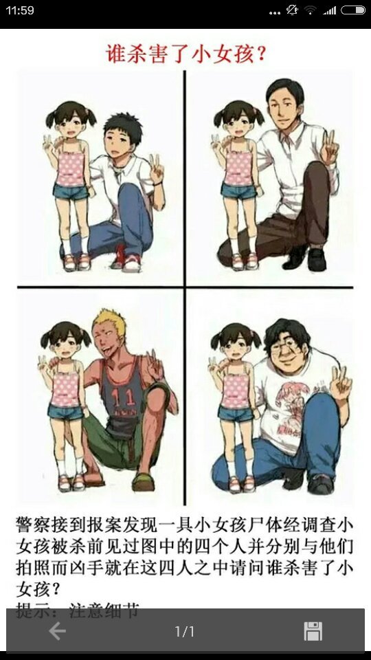 第三个人,他的裤裆中间,有异常;四张图里面只有他的蹲姿不一样,因为小女孩已经死了,他用膝盖撑着。