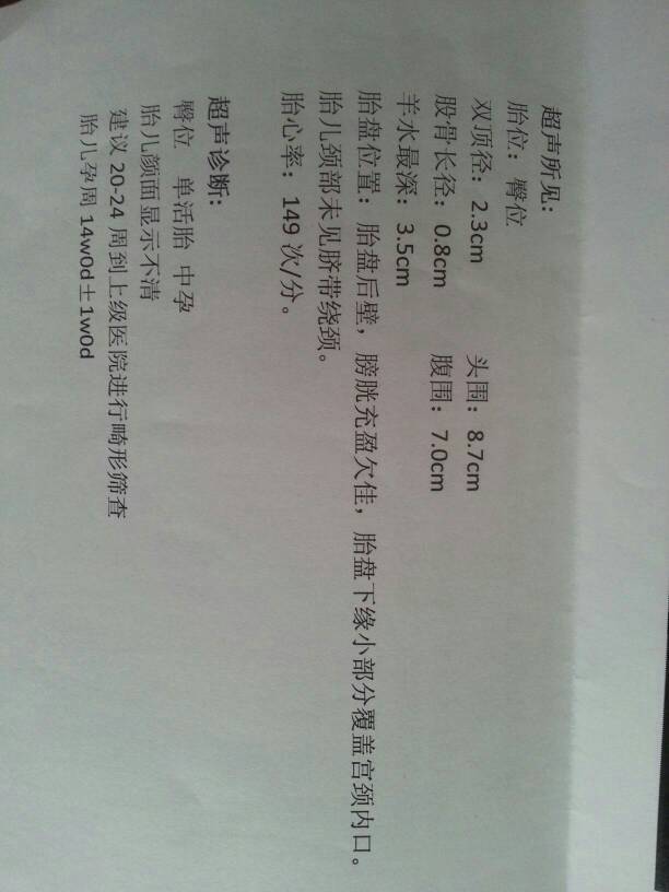 请问专家这个B超检查结果有问题么? 请问专家这个B超检查结果有问题么? 点击展开 sunnydownload 2014-06-20 16:29 为您推荐: 其他回答 从检查数据上看,没有什么,异常,现在是臀位,你现在是早孕,是很普遍的现象,三十二周,宝宝就会将胎位转为头位,但是胎位是不断变化的,胎儿在入盆之前胎位都是不定的,现在安心养胎 潇洒行走天涯 2014-06-20 16:39 相关问题 请专家帮忙看看怀孕B超检查结果,急!!! 麻烦专家帮我看看,我现在怀38+1周,请问看B超上写的我可以顺产么?有不有可能提前生? 要怀孕了,做的B超检查结果,麻烦帮我看下有没有问题?谢谢