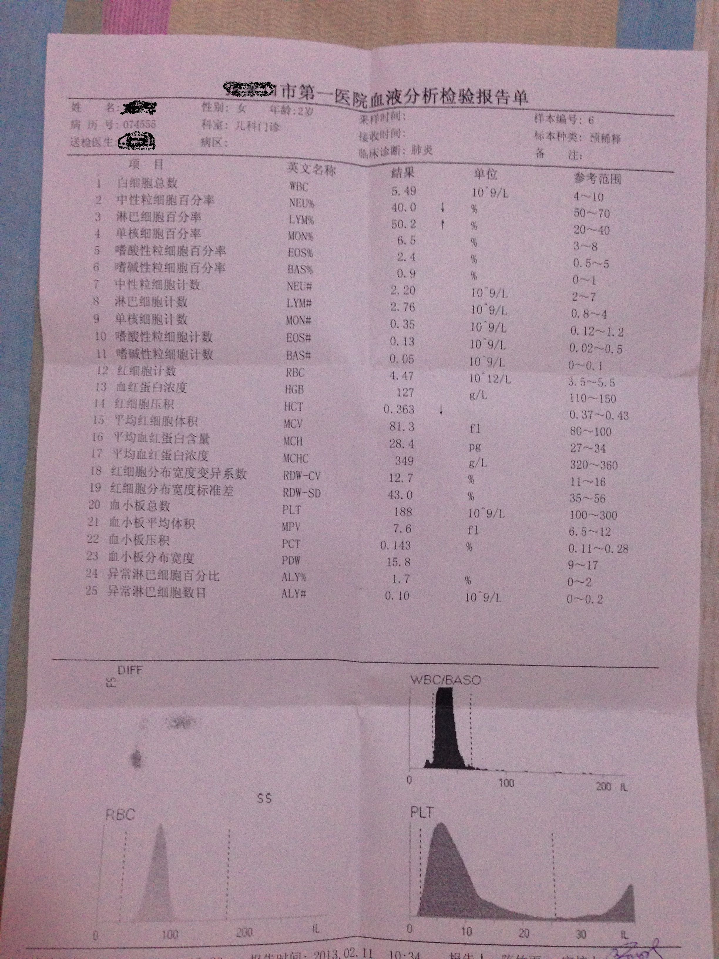 不像是肺炎,肺炎起码WBC会升高或者中性粒细胞升高会比较明显, 实在不放心就去拍个胸片。淋巴细胞比值升高。我看这个症状像是普通感冒。。 吃点小队抹柴胡残耗颗粒和利巴韦林颗粒or 抗病毒(报眠生香雪)应该差不多了。