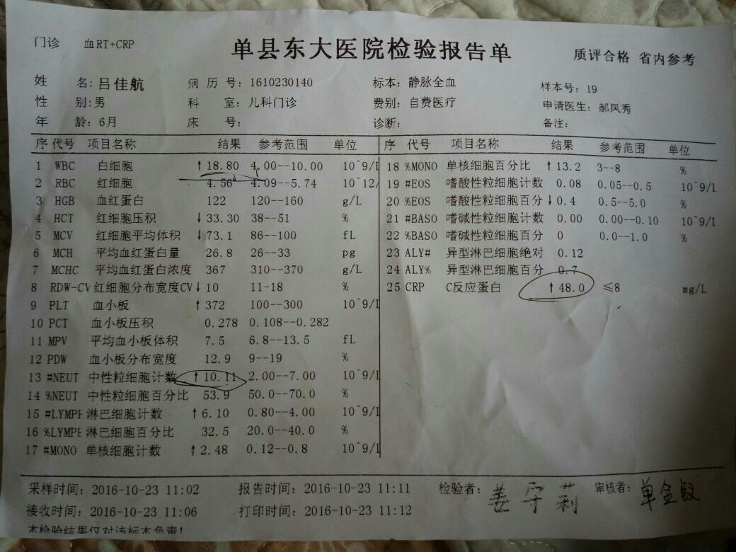 六个月婴儿 验血单子 感冒发热 流鼻涕 偶尔咳嗽 经常流眼泪 可以不打针输液吗? 六个月婴儿 验血单子感冒发热 流鼻涕 偶尔咳嗽 经常流眼泪 可以不打针输液吗?吃药可以吗 点击展开 匿名用户 2016-10-23 12:08 满意回答 孩子血象高,考虑存在细菌感染,抵抗力好的可以口服药物 ɳĮ 2016-10-23 12:09 宝宝知道提示您:回答为网友贡献,仅供参考。 相关问题 一冷一热感冒了,流鼻涕,鼻子不通,流眼泪!打喷嚏 要怎么办…怀孕不想打针输液!!! 小孩1周岁,过年回老家呆了几个月,期间发热,老人着急,直接带着输液了,现在发热吃药打针效果都不好 宝宝反复低烧,验血是病毒感染,不打针输液的能好不?