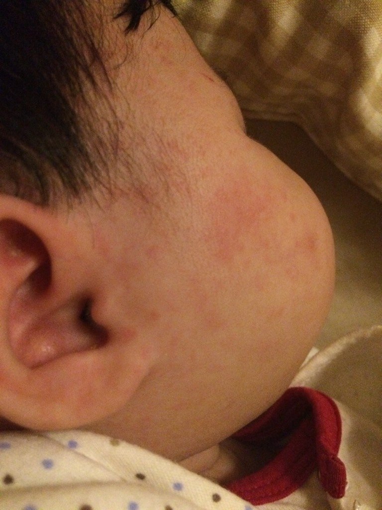 四个月大的宝宝身上和脸上起一大片一大片红的,腿上起疙瘩,先肿然后起水泡,怎么回事,求助