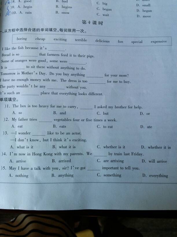 填空(从团菠蔑上到下的顺安缠序) delicious;cheap;terrible;boring;special;expensive;fun;exciting。 选择(从上到下的指敢顺序)A C D B C