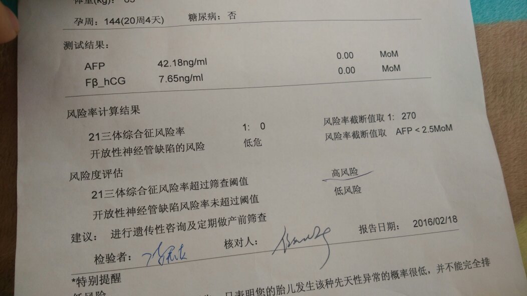 唐筛结果21三体综合征风险值1比0是怎么回事 点击展开 匿名用户 2016-02-19 15:13 满意回答 你好,你的洞怨这个数值需要注意,毕叹尺竟不能确定情况,建议还是考虑做进一步检查,做个羊水穿刺,21三体查的是唐氏综合症狼铜扬,所以还是需要注意的 ˿5784 2016-02-19 15:22 宝宝知道提示您:回答为网友贡献,仅供参考。 相关问题 唐筛结果21三体综合症风险值跟1:1200,医院临界为1:270 唐筛结果21—三体综合征风险值:1:11 唐筛检查21三体综合征高风险怎么办?