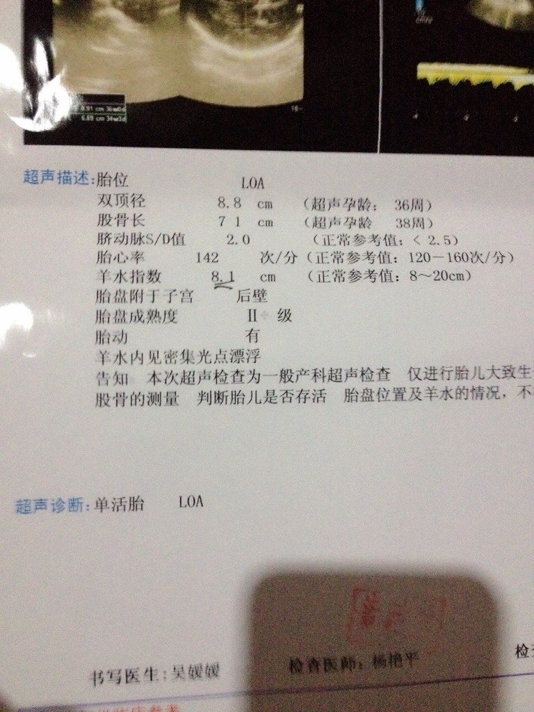 孕38周6天,请问这个单子正常吗?宝宝有多少斤了? 孕38周➕6天,请问这个单子正常吗?宝宝有多少斤了? 点击展开 旧人旧情、旧 2014-08-07 20:55 为您推荐: 其他回答 宝宝在5斤多了,羊水超标了,少喝水 妈妈的爱欣 2014-08-16 21:51 正常的,六斤左右 栩栩宝贝专属 2014-08-16 20:39 30乘以86再加上200,也就是2780,也就是五斤多吧 肿瘤小大夫 2014-08-07 21:59 正常的,都在正常范围的,你宫高、腹围是多少,宫高乘以腹围,再加上200,所得克数就是胎儿体重 肿瘤小大夫 2014-08-07 20:57 相关问题 有麻麻和我一样孕20周的吗?我已经胖了12斤:真担心这样下去:变肥婆:孕前98斤(161)! 没怀孕之前体重是92斤现在是孕中期103斤长了十多斤难道宝宝有那么重吗?