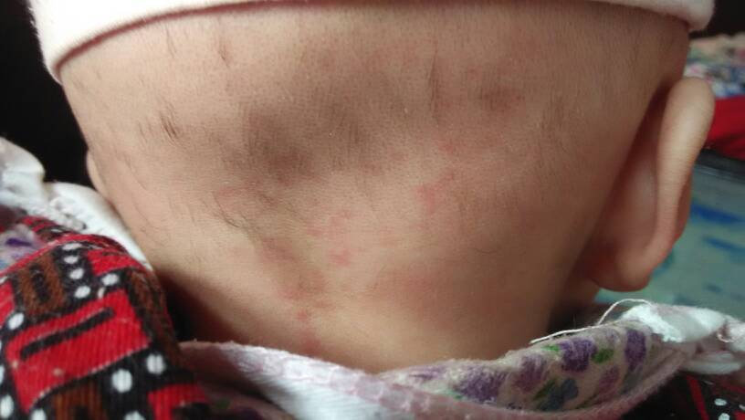 宝宝四个月,三天前宝宝开始睡觉摇头,后来发现她脖子后有红色的片状,这是什么,湿疹吗?怎么治疗对宝宝
