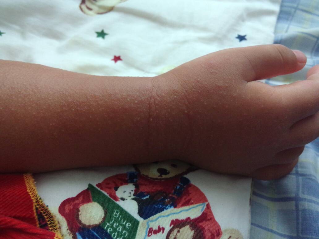 宝宝颈部,额头,手,胳膊出现红色小疙瘩,像针头那么小,一片片,摸起来不平滑,宝宝头部的痒,但是胳膊