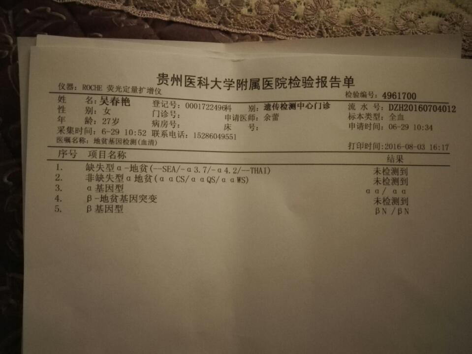 地贫基因检测结果表示看不懂?请帮忙看看 地贫基因检测结果表示看不懂?请帮忙看看。 点击展开 威武949 2016-08-03 19:33 为您推荐: 其他回答 祝你好孕。 哎!悔 2016-08-03 20:15 问问医生吧 02345 2016-08-03 20:05 咨询下医生吧 150*****580_6hLO 2016-08-03 19:59 不懂哦。z z YYMM 2016-08-03 19:58 ,多注意休息 安妮宝贝月儿 2016-08-03 19:58 加载更多 相关问题 帮我看看地贫基因检测结果 无创产前基因检测结果显示:胎儿T21/T18/T13三体为低风险!还需进一步做羊水穿刺吗? 收到唐筛复查短信(无创产前基因检测结果显示:胎儿T21/T18/T13三体为低风险)之前检查是T21高风险1:131