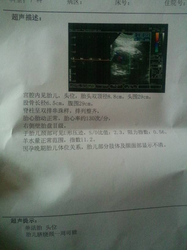 你好,胎儿的体重大概是在5斤左右的吧,羊水指数的测量值在正常范围的,胎心正常,
