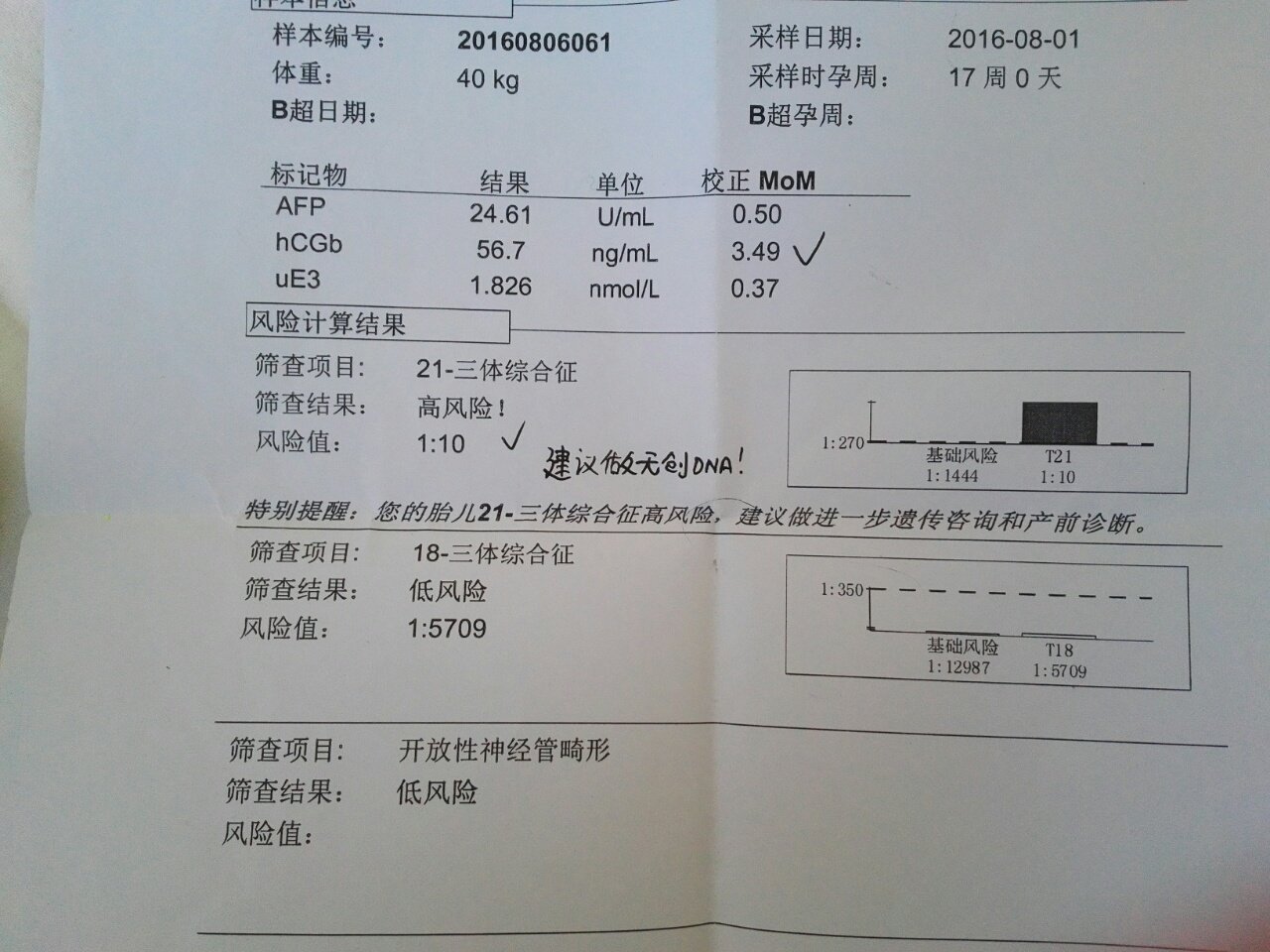 这是我17周做的唐氏筛查,结果出来医生让我做DNA,我这是第二胎了,第一胎,我就没有做唐氏筛查,请问大夫,我这个必须得做吗?请问DNA是抽血化验还是怎样做呢? 这是我17周做的唐氏筛查,结果出来医生让我做DNA,我这是第二胎了,第一胎,我就没有做唐氏筛查,请问大夫,我这个必须得做吗?请问DNA是抽血化验还是怎样做呢? 点击展开 159*****202_djWY 2016-08-19 15:02 为您推荐: 其他回答 抽血化验! 媛🙊 2016-08-25 22:10 祝你好运。。 不哭不闹健康快乐 2016-08-25 18:59 应该是验血的。。 平安快乐小笑笑 2016-08-25 17:27 抽血化验吧, 珍晓 2016-08-25 14:00 抽血。。. 以艻 2016-08-25 09:26 加载更多 相关问题 你们好!我照相不清楚!我做唐氏筛查:唐氏综合征1:963!18/13三体风险系数1:864!大夫的意思是让我做无dna!我也不懂!!我想问一下用做吗?!谢谢 希望各位大夫,专家帮帮我,我怀孕17周二胎,唐诗风险为1:240我到底要不要去做羊水穿刺? 大夫您好,我孕17周查出TSH偏高,化验报告如照片 医生给开了优甲乐,叫我每天吃1/4后一个月复查