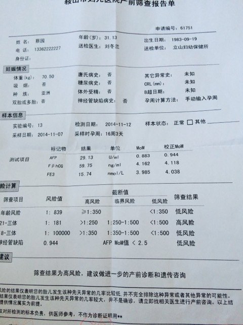 唐氏筛查高危险 唐氏筛查高危险 点击展开 怺逺卟薆 2014-11-13 13:56 为您推荐: 其他回答 如果正常的话,胎儿应该没有问题的。 shenglongxiao 2014-11-13 16:21 做个羊水穿刺 家有儿女*^_^* 2014-11-13 14:27 做无创Dna 茉香香 2014-11-13 14:17 做羊水穿刺 不爱人 2014-11-13 14:15 一样有高风险 一季漂零的思念L★Ve 2014-11-13 13:59 加载更多 相关问题 唐氏筛查,osb值1:594很危险吗? 唐氏筛查高危险 有唐氏筛查高危险的吗?