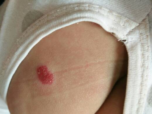 大家帮忙看看这个是不是血管瘤 刚出生时候半个绿豆大小 现在黄豆大了 红色是突出皮肤的