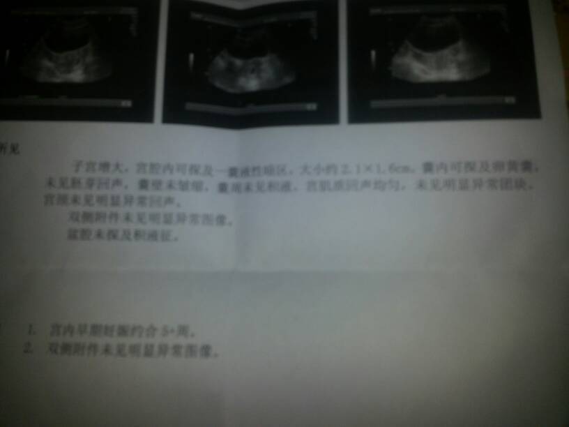 超声所见:子宫增大,宫腔内可探及一囊液性暗区,大小约2.1×1.6cm 囊内可探及卵黄囊,未见胚