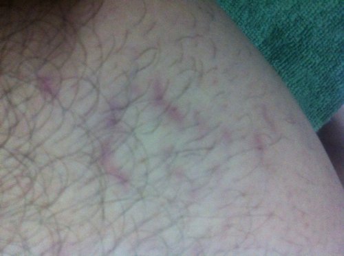 大概有四五个月了,两大腿内侧有些暗紫的道印,两胳膊腋下边也有些,不过摸起来不疼不痒,像是嫩肉皮,不