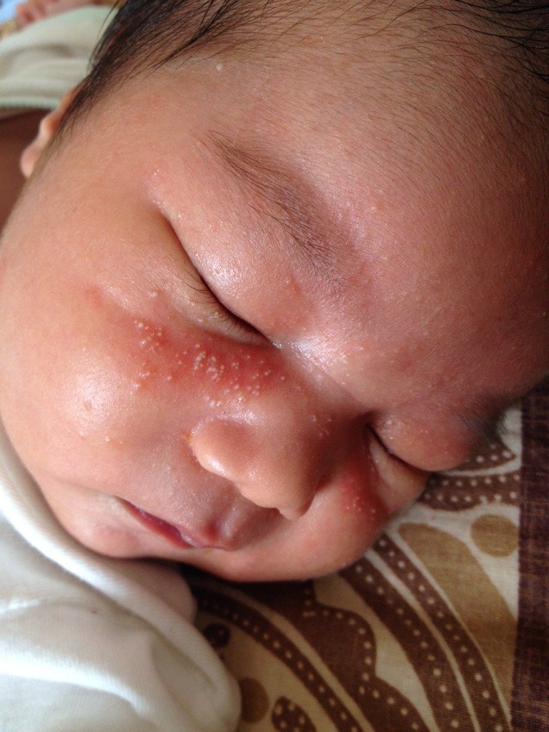 这两天突然出生20天的儿子脸发成图片这样子 是湿疹么?我准备泡点黄连水给他擦脸可以么?我们是纯母乳