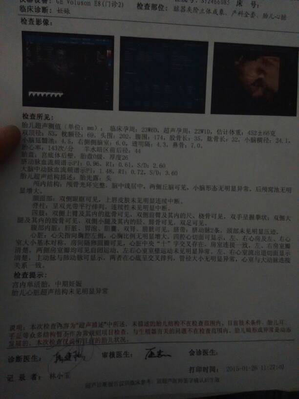 有医生在吗 帮我看一下 这张 有医生在吗 帮我看一下 这张 帮我看一下 孩子怎么样 点击展开 农村阿伟 2015-01-26 20:36 为您推荐: 其他回答 看不清楚,黑忽忽的 15...1@qq.com 2015-01-26 21:32 你好,报告没有提示胎儿异常情况,胎儿的大小相当于怀孕24周左右的,建议按时产检。 文斯6 2015-01-26 21:08 补点营养, 爱妮❤ 2015-01-26 20:44 小一周正常的, 爱妮❤ 2015-01-26 20:44 不是,我看挺正常的 爱妮❤ 2015-01-26 20:40 加载更多 相关问题 w有医生帮我看一下七周的彩超单吗? 今天去做B超,医生说我羊水少下限,叫我住院观察,医生帮我看看这张B超纸有什么问题