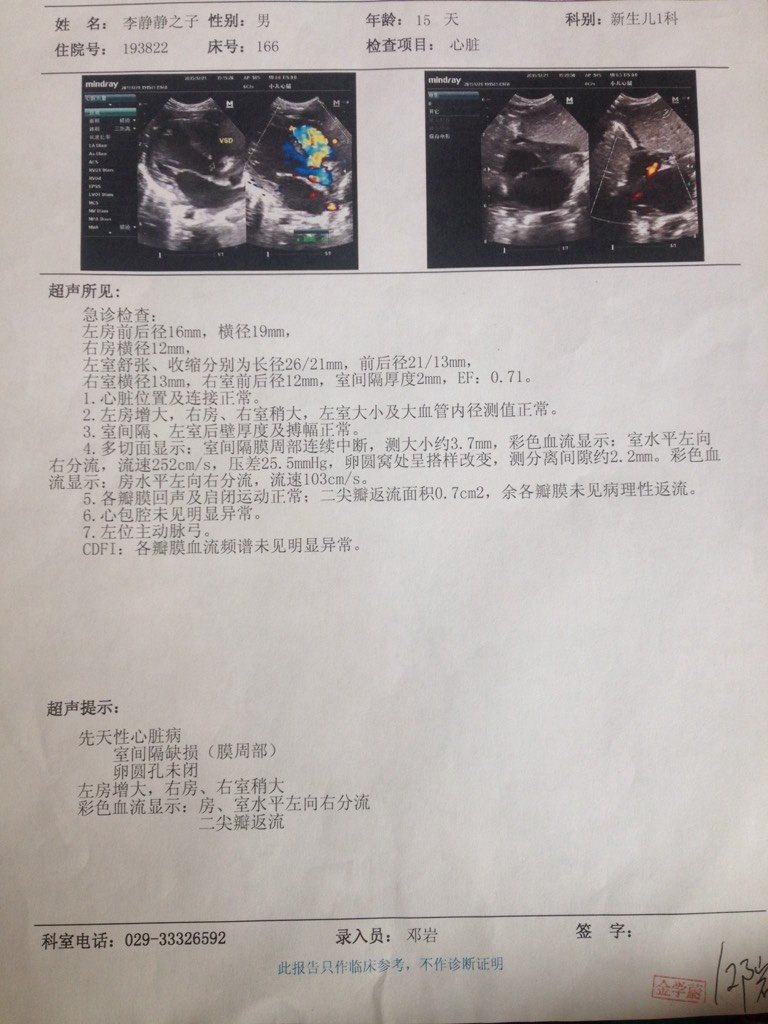 先天性心脏病出生18天,室间隔缺损膜周部大小约3.7mm,卵圆孔未闭,左房增大,右房,右室稍大 房
