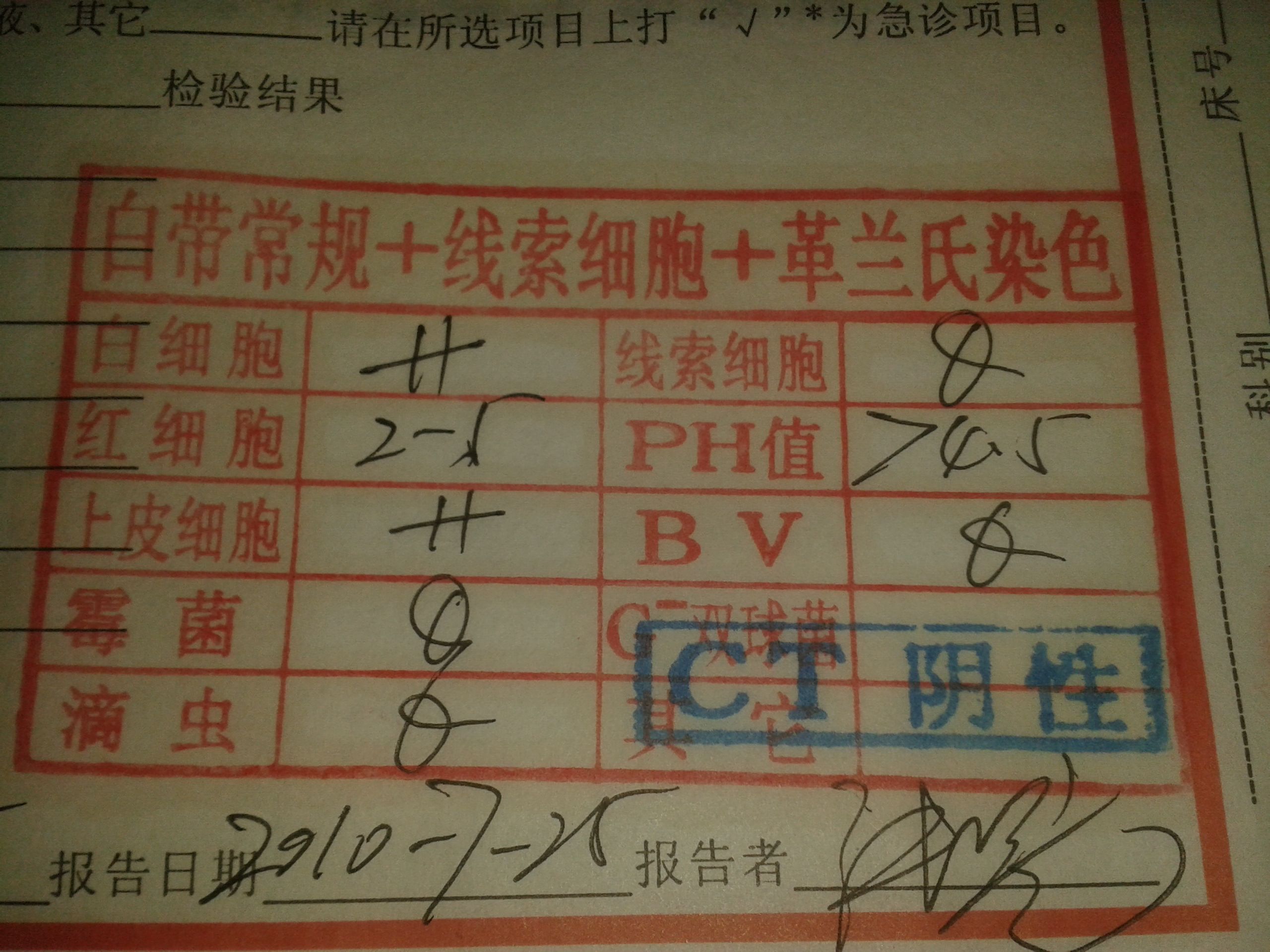 白带常规线索细胞革兰氏染色化验报告谁看得懂,请专业人士进 点击展开 匿名用户 2013-06-15 21:35 满意回答 这个报告显示都正常,没有霉菌,没有滴虫、没有炎症。 赏夜南_y2Lw 2013-06-15 22:22 宝宝知道提示您:回答为网友贡献,仅供参考。 相关问题 白带常规+线索细胞+革兰氏染色 我做的白带化验清洁度3,霉菌-,白细胞++,滴虫-,红细胞-,线索细胞+,上皮细胞没有,请问严重么? 我做的白带化验清洁度3,霉菌-,白细胞++,滴虫-,红细胞-,线索细胞+,上皮细胞没有,请问严重么?