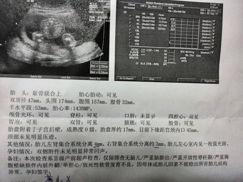 病情分析: 你好,胎儿双顶径47mm相当于怀孕20周加,头围174mm相当于怀孕20周,腹围157mm相当于怀孕20周加,股骨长32mm相当于怀孕20周减。 指导意见: 根据彩超结果看,胎儿发育正常,与实际孕周相符合,胎心,胎盘,羊水都在正常范围内,胎儿双肾分离不超过10mm为正常,左心室强光斑,多...